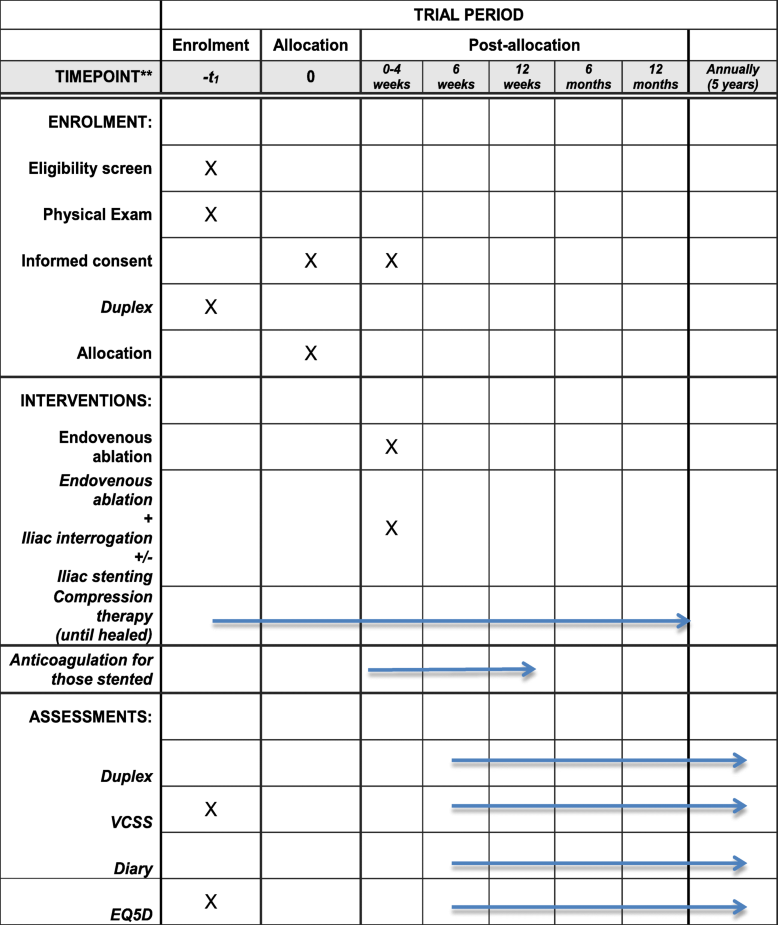 From: DEep VEin Lesion OPtimisation (DEVELOP) trial: protocol for a randomised, assessor-blinded feasibility trial of iliac vein intervention for venous leg ulcers